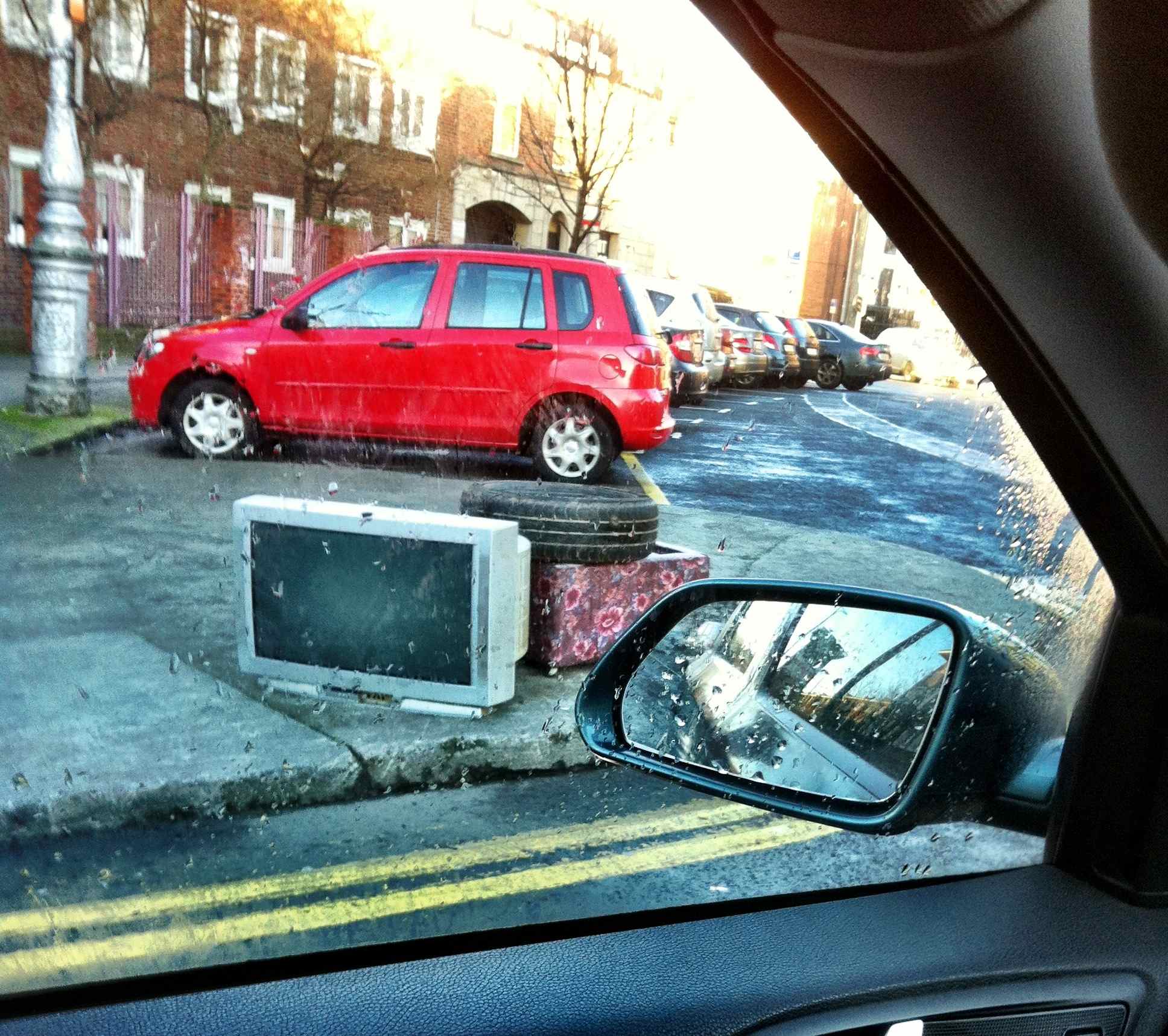 opposite the hospital. another TV on the other side, throught the flats!
