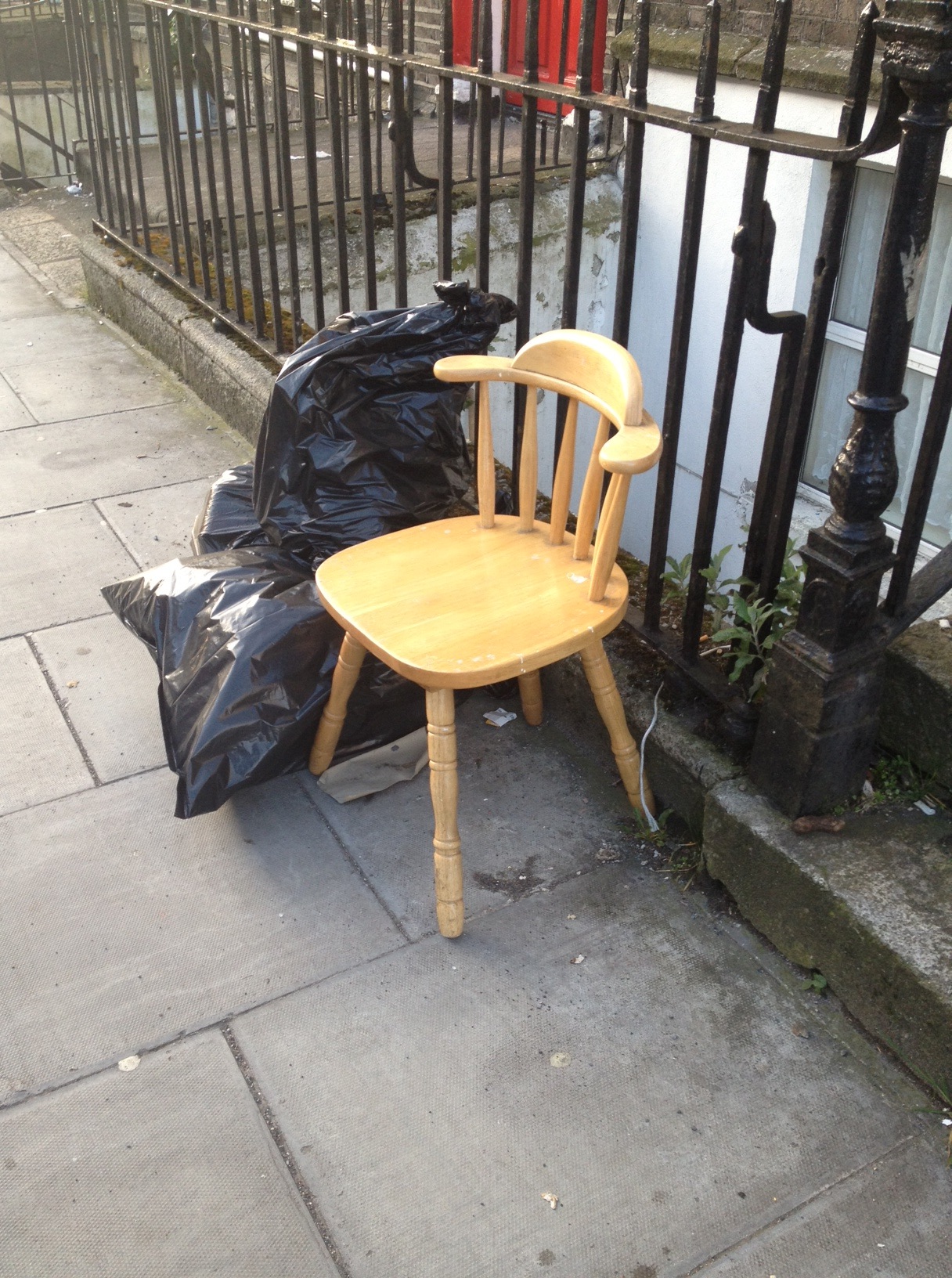 With thx to DK. In this powerful piece, the empty chair symbolises urban alienation, while the bags of rubbish symbolise … bags of rubbish
