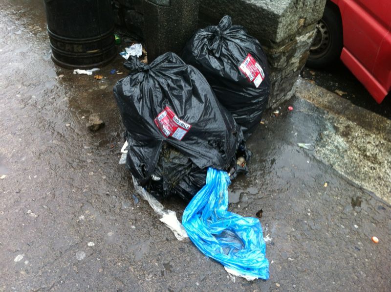With thx to Seth M, who says ” tagged Greyhound bag left there to fester for about a week now, one of the bags is torn so god knows whose duty it is to clear it up.”