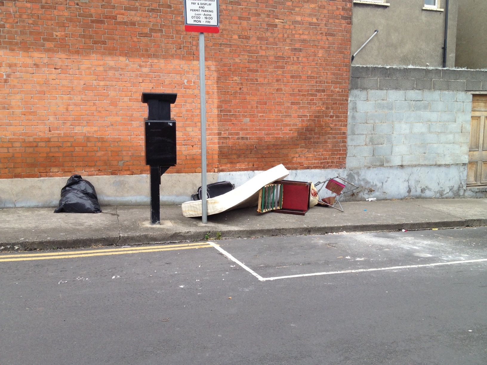 With thx to Liz G, who says “Skip was removed early this morning – leaving behind all this. Corner of Wellington St and Primrose St.”