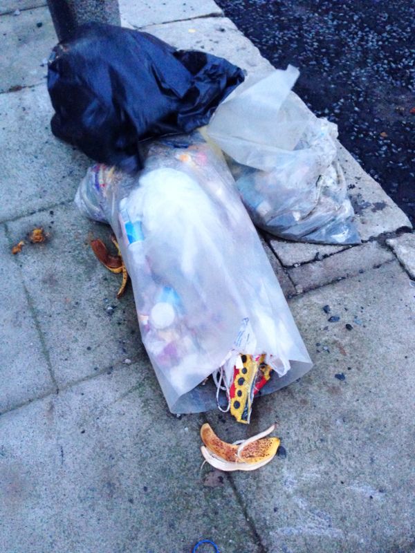 With thanks to JC, who says “Outside 22 Belvedere Place – pic taken this morning and this bag was still there at 6pm, complete with banana skin.”