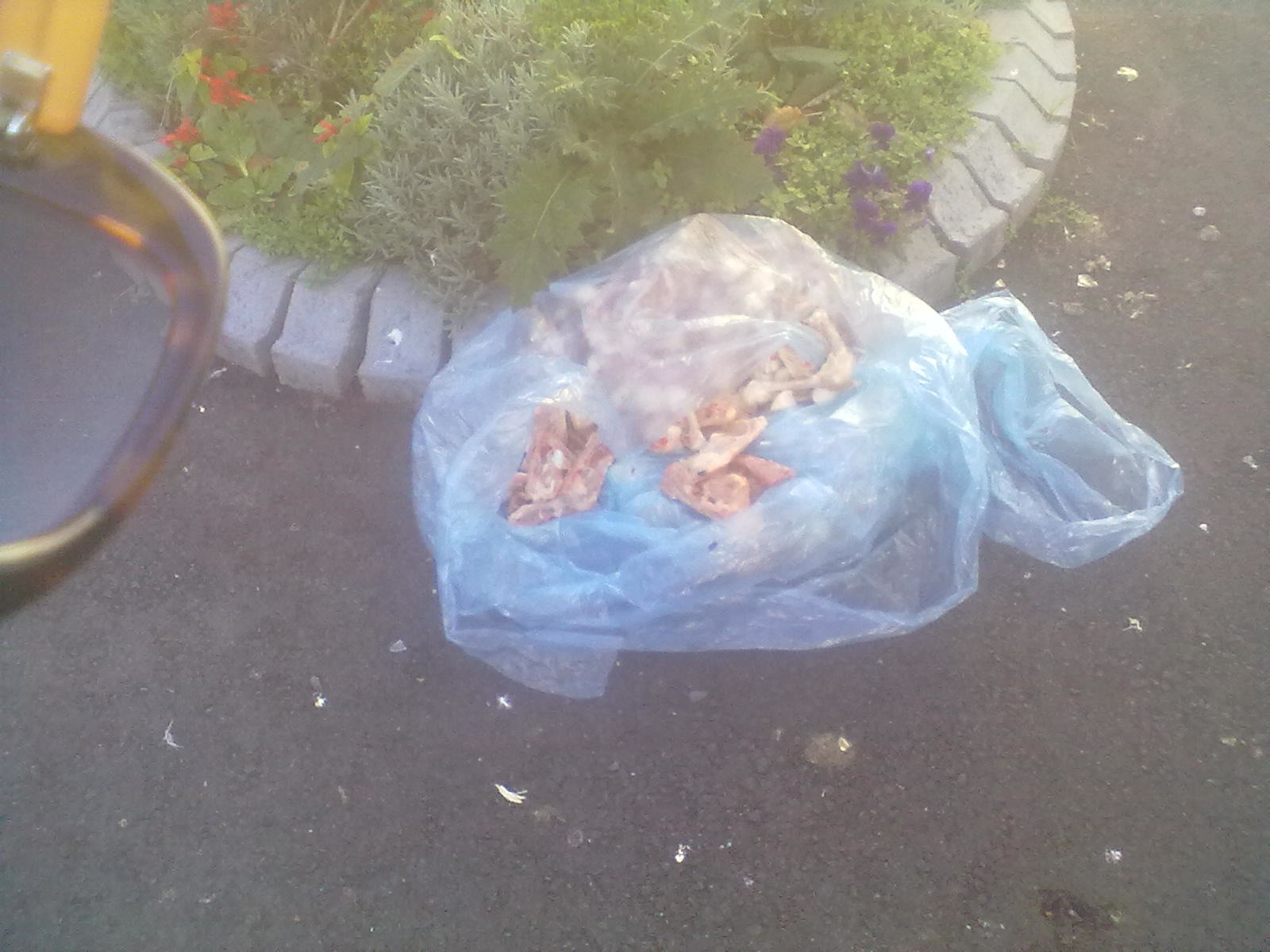 With thanks to PC, who says “This is not domestic dumping, as the amounts are to great. It obviously comes from a restaurant or take way business in the area who refuses to pay for the disposal of their surplus or out of date food. We are seeing this more and more in the area and have had large boxes of sausage, bags of chicken legs, wings and red meat all dumped in the last few weeks. Previously we caught a man dumping from a Chinese restaurant. He would regularly drive his car into the square in the early hours, and unload boxes and bags of food and packaging.”