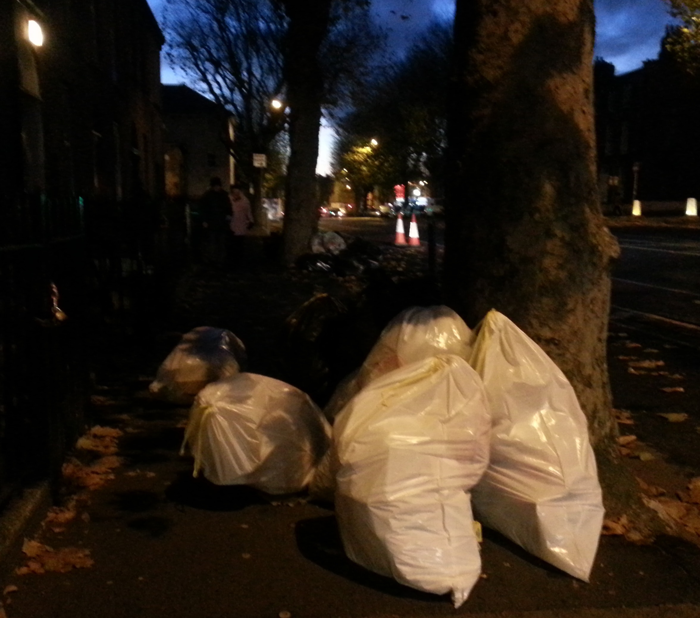 With thanks to MTmcG, who says “Wednesday AM A swarm of bags; No matter the obstacle; No tags to be seen but ready for collecction!”