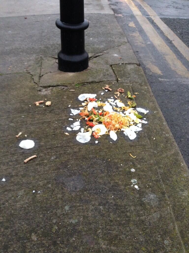 With thanks to @MrMattHague, who says “Someone is regularly dumping insane amounts of food on Blackpitts outside Scholars pub. Like this.”