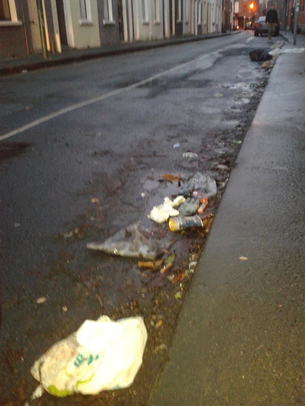 Spot the binbags in the gutter,as well as the litter -> Earl St South, D8. Jan 05 2014