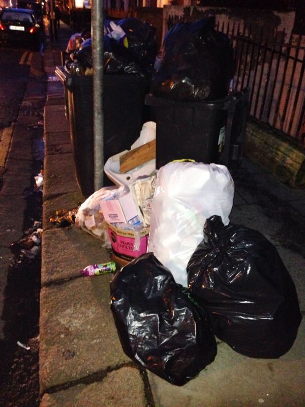 ← Large,hazardous pile of waste.Slippy underfoot with leakage -> Outside No.27 Gardiner Place, D1. Jan 08 2014