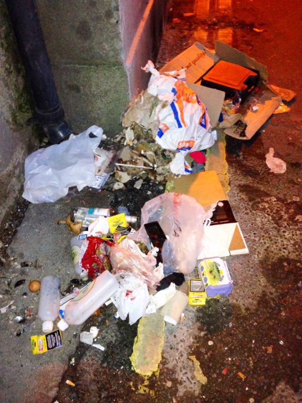 With thanks to JC, who says “Just a representative selection from Belvedere Place at 8am Wednesday morning. Mixed tagged, fake-tagged and recycling bags contaminated with food waste.”