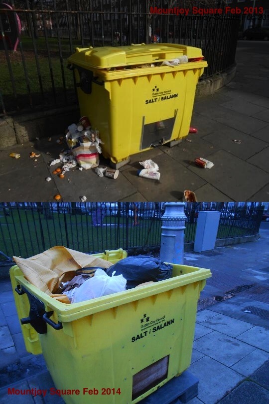 With thanks to @barratemple, who says “The situation is improving. Rubbish is not dumped but placed in a container although not the right one @DublinLitter. that’s the South-West corner of Mountjoy Square. I took this other picture about one year ago. The worst in on Mondays as the dumpers know that it’s collection day”