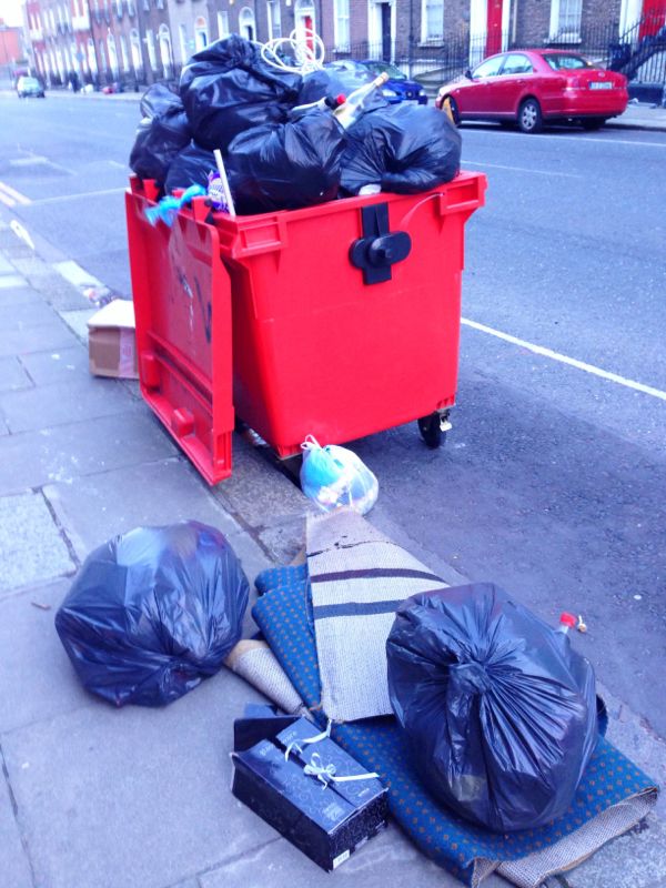 With thanks to JC, who says “overflowing bin outside 39-40 Belvedere Place D1 – packaging material blown all over the place.”