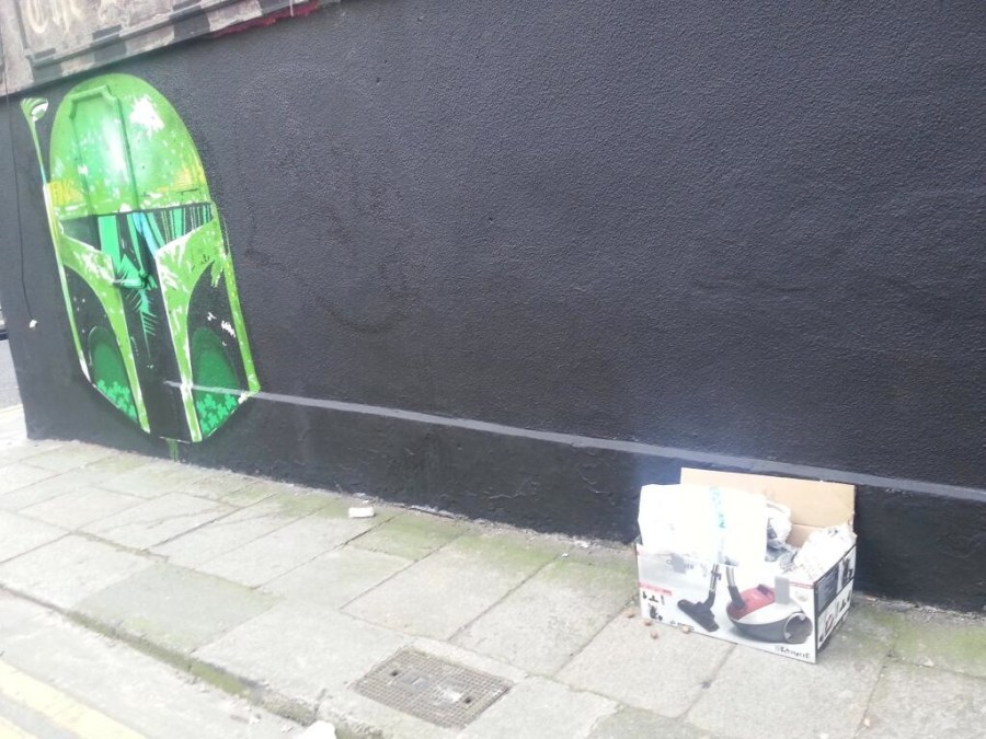 Nice Street Art, shame about the box of rubbish -> St Mark’s Alley West, D8. Mar 15 2014