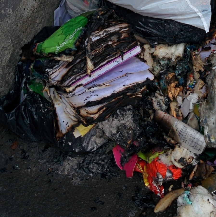 ← Attempted fire-setting.Rubbish contains personal info(notebooks etc), perhaps an oul fine? Nah,thought not -> Belvedere Pl, D1. Apr 23 2014
