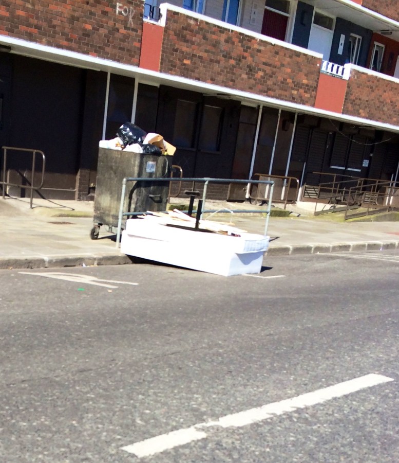 Overflowing skip plus mattress in the road -> Dominic St, D1. Apr 24 2014