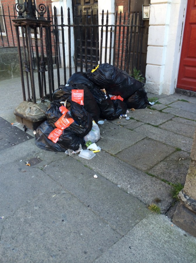 ← Warden’s been here, red stickers,but no deterrent as more bags added since -> Dominic St, D1. Apr 24 2014