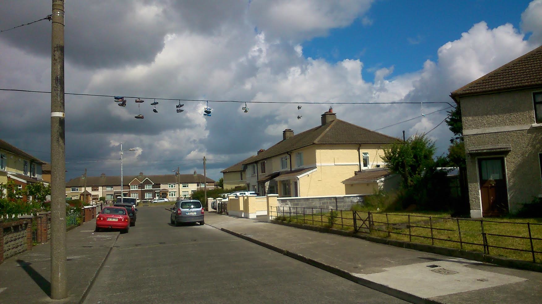 With thanks to J, who says “Trainers and other materials on wire between 20 & 118 Cashel Avenue Crumlin Dublin 12”