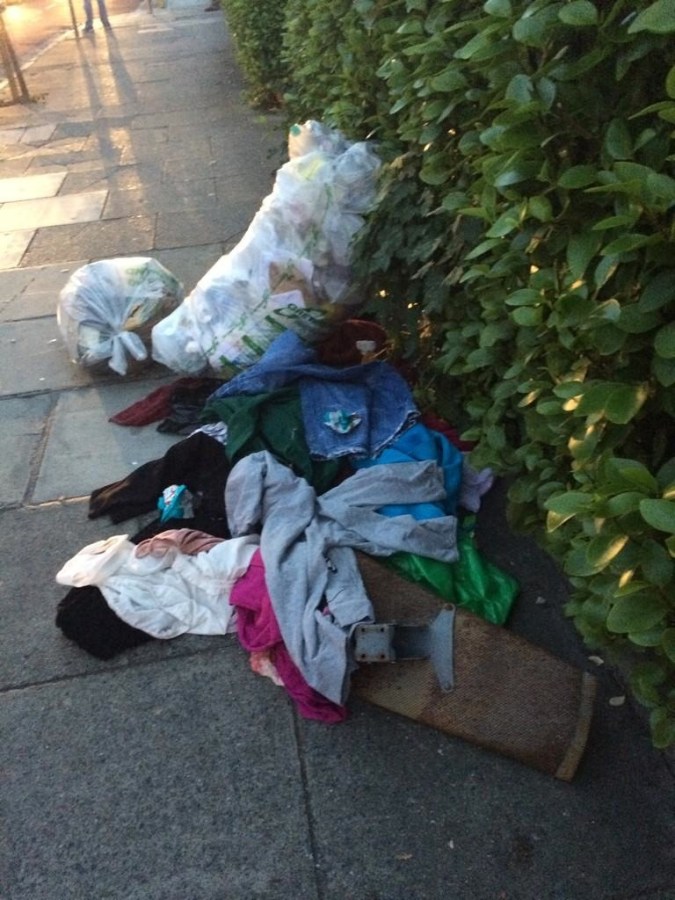 ← Dumped clothing (?) & some uncollected recycling bags fyi @GreyhoundHH -> Berkeley Rd & NCR, D7. Sep 29 2014