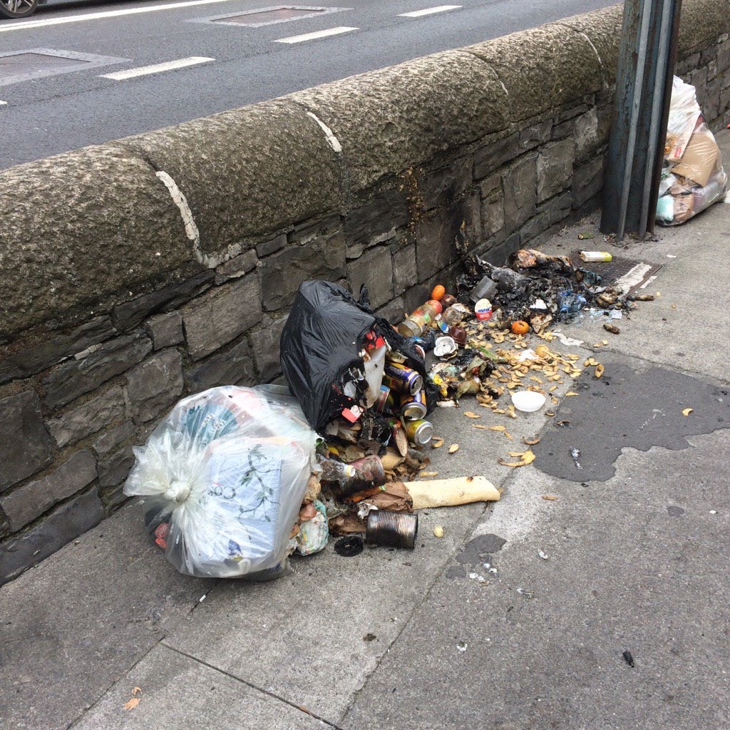 With thanks to @dumpingstuff, who says “@DublinLitter north strand / Newcomen bridge D3. Burnt bags. Rotten fruit and meat spilling out”