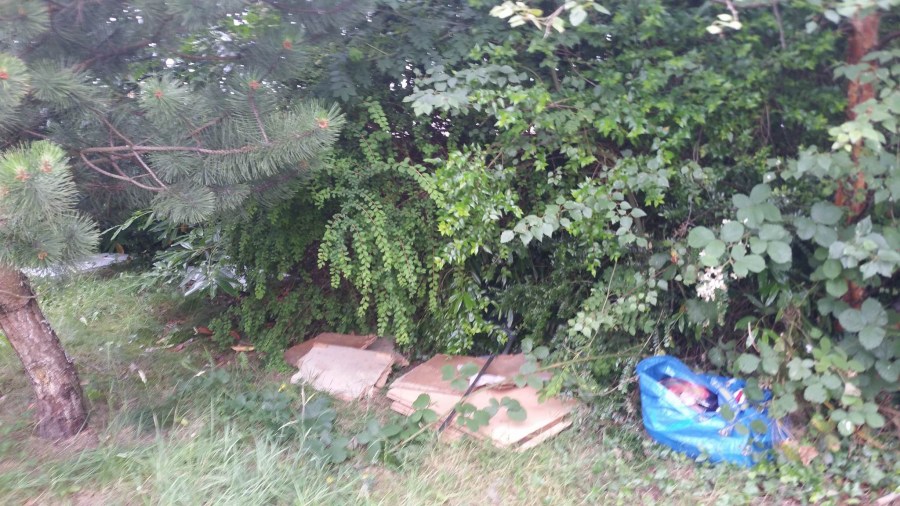 plywood + a discarded door visible in this patch -> Ballentree Grove #3, D15. Jul 10 2017